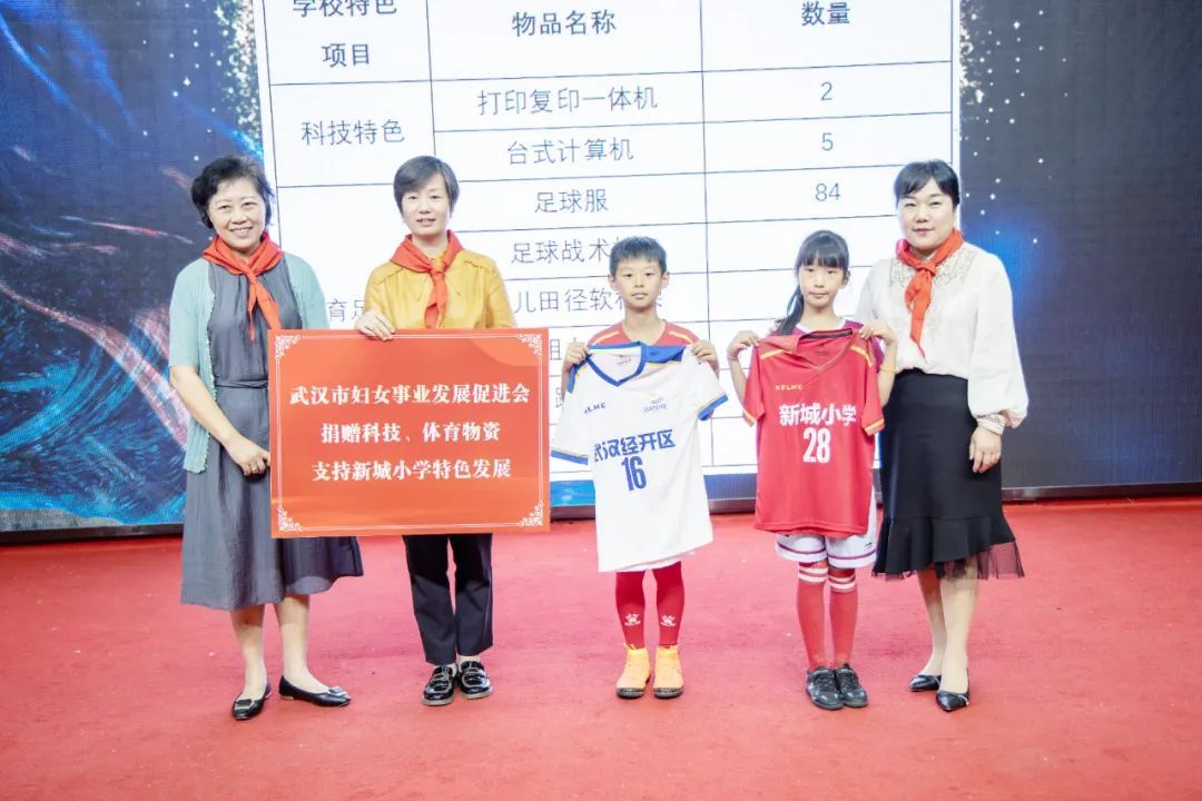 武汉经开区教育局党委书记、局长熊白莉上台致辞。她指出,武汉市妇女事业发展促进会与各位市老领导来到经开区新城小学开展捐赠慰问活动,充分展现了对经开区教育工作的厚爱和对孩子们健康成长的期望。希望新城小学以此次活动为新起点,落实好立德树人根本任务,继续秉承“快乐童年 多彩人生”的办学理念,用好捐赠的教育资源,将足球这一办学特色发扬光大,用优秀的办学成果回馈各级领导和社会各界的关心支持。